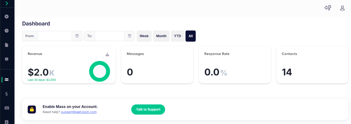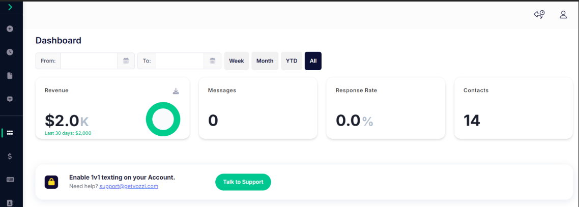 We’re kicking off Vozzi Release Week with a big one. Meet the new Vozzi Dashboard — an SMS marketing dashboard redesigned to give teams clearer visibility into performance, revenue, and engagement, all in one place. Whether you’re focused on mass messaging, 1v1 conversations, or revenue-driving products like Text-to-Buy and Mobile Billboards, the dashboard now adapts to your setup and shows what matters most.