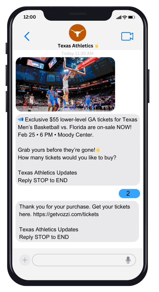 One of the most impressive campaigns we saw this quarter came from Texas Athletics using Vozzi’s Text-to-Buy.