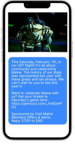 This campaign promoted the Mariners’ themed 207 Night, celebrating Maine while integrating Visit Maine as the presenting sponsor of the SMS message.
